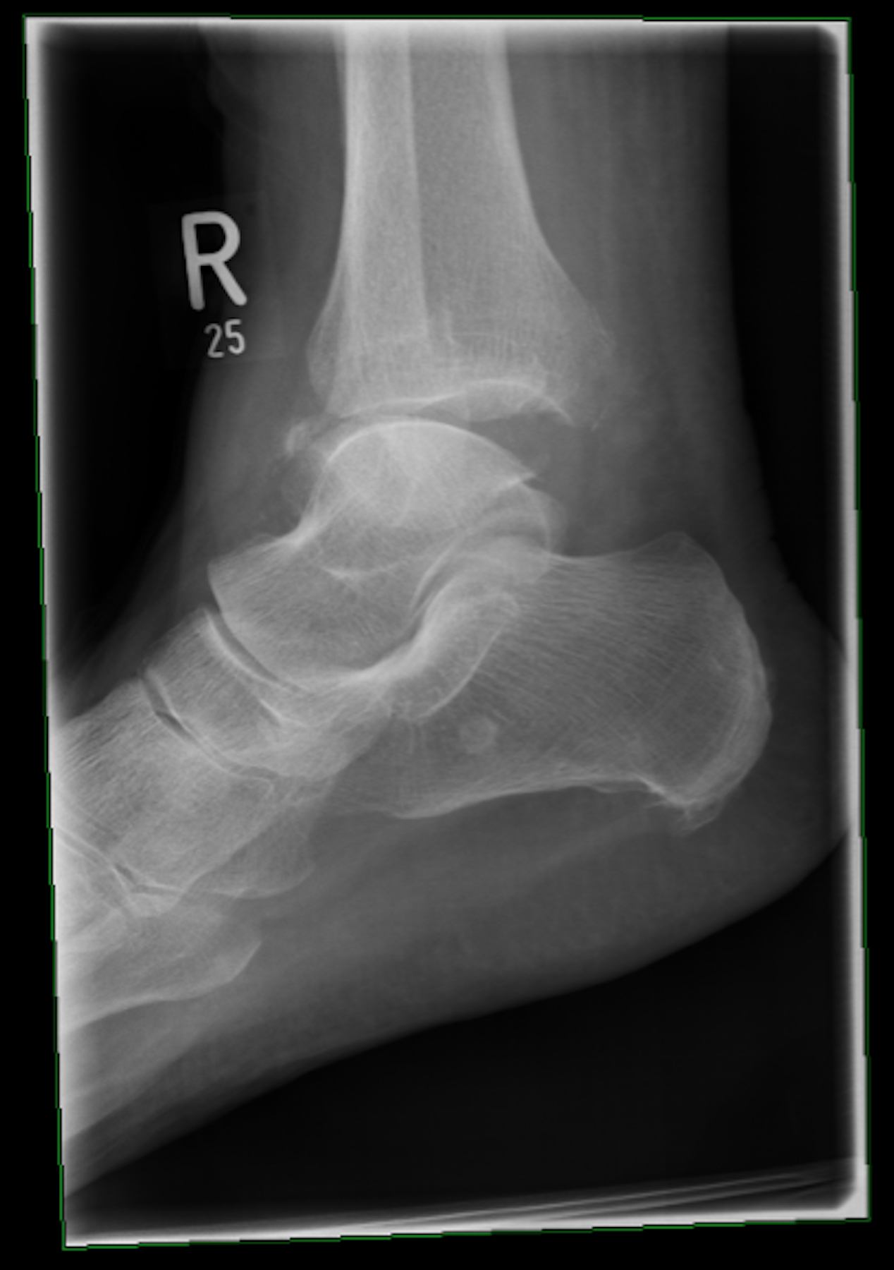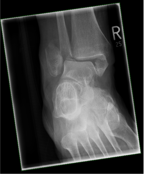 Sie werden zu einem als "orange" (sehr dringend) eingestuften Patientenfall ins Behandlungszimmer gerufen. Dort finden Sie eine 91-jährige Frau vor, die in Begleitung einer Notärztin in die Notfallambulanz eingeliefert wurde. Die Notärztin übergibt Ihnen die Patientin und berichtet, dass diese in ihrer Wohneinheit gestürzt sei und den Hausnotruf betätigt hätte. Beim Eintreffen sei der rechte Fuß im Sprunggelenk 90° nach lateral abgestanden und die Notärztin hätte diesen sofort reponiert und geschient. Eine offene Fraktur sei nicht erkennbar gewesen. Die Patientin habe insgesamt wenig Schmerzen gehabt und sei dauerhaft kardiopulmonal stabil und bei Bewusstsein gewesen.