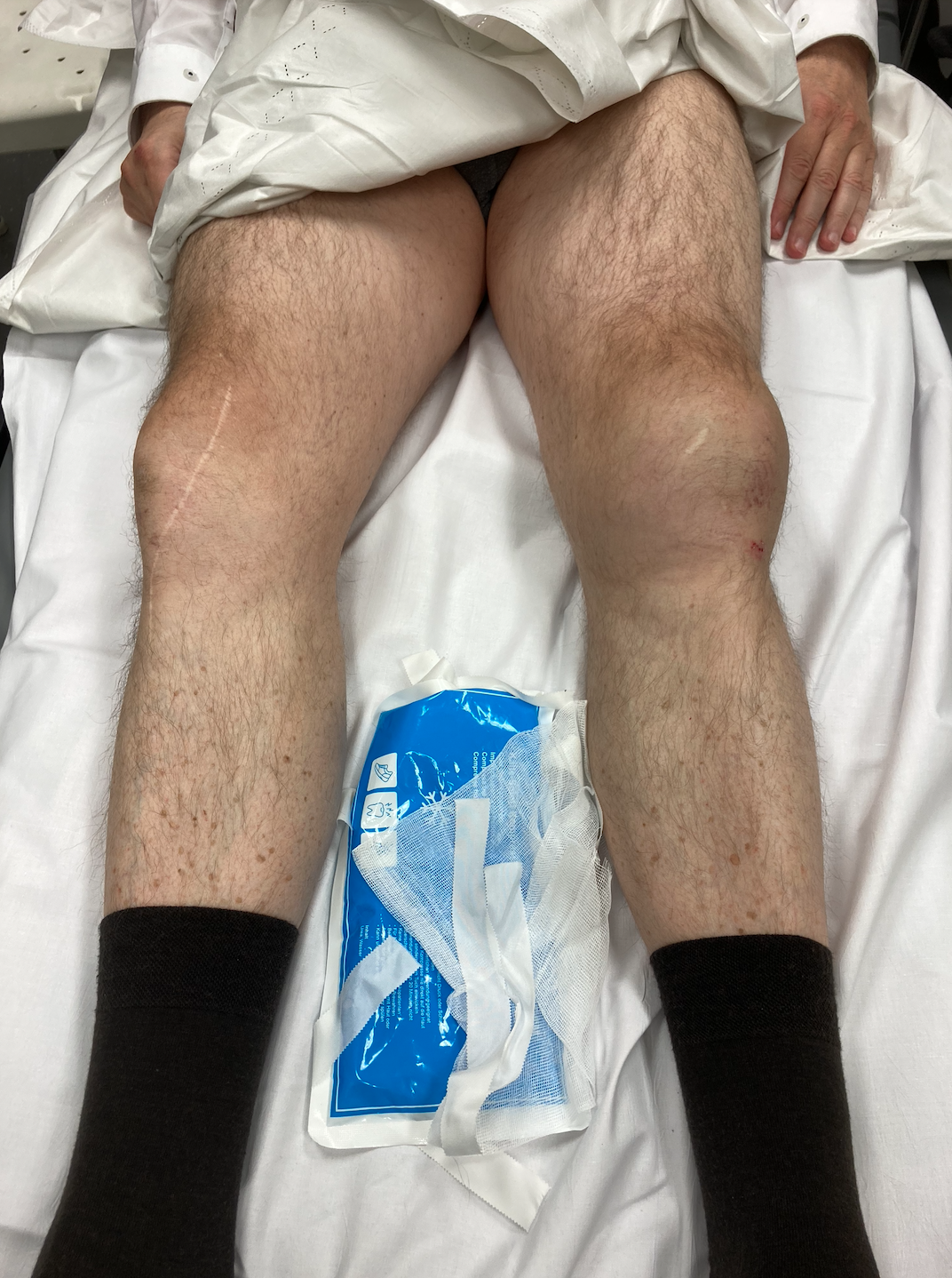 Keine relevanten Vorerkrankungen, keine bekannten Allergien, keine Dauermedikation. Der Patient berichtet vor vielen Jahren am rechten Knie operiert worden zu sein.