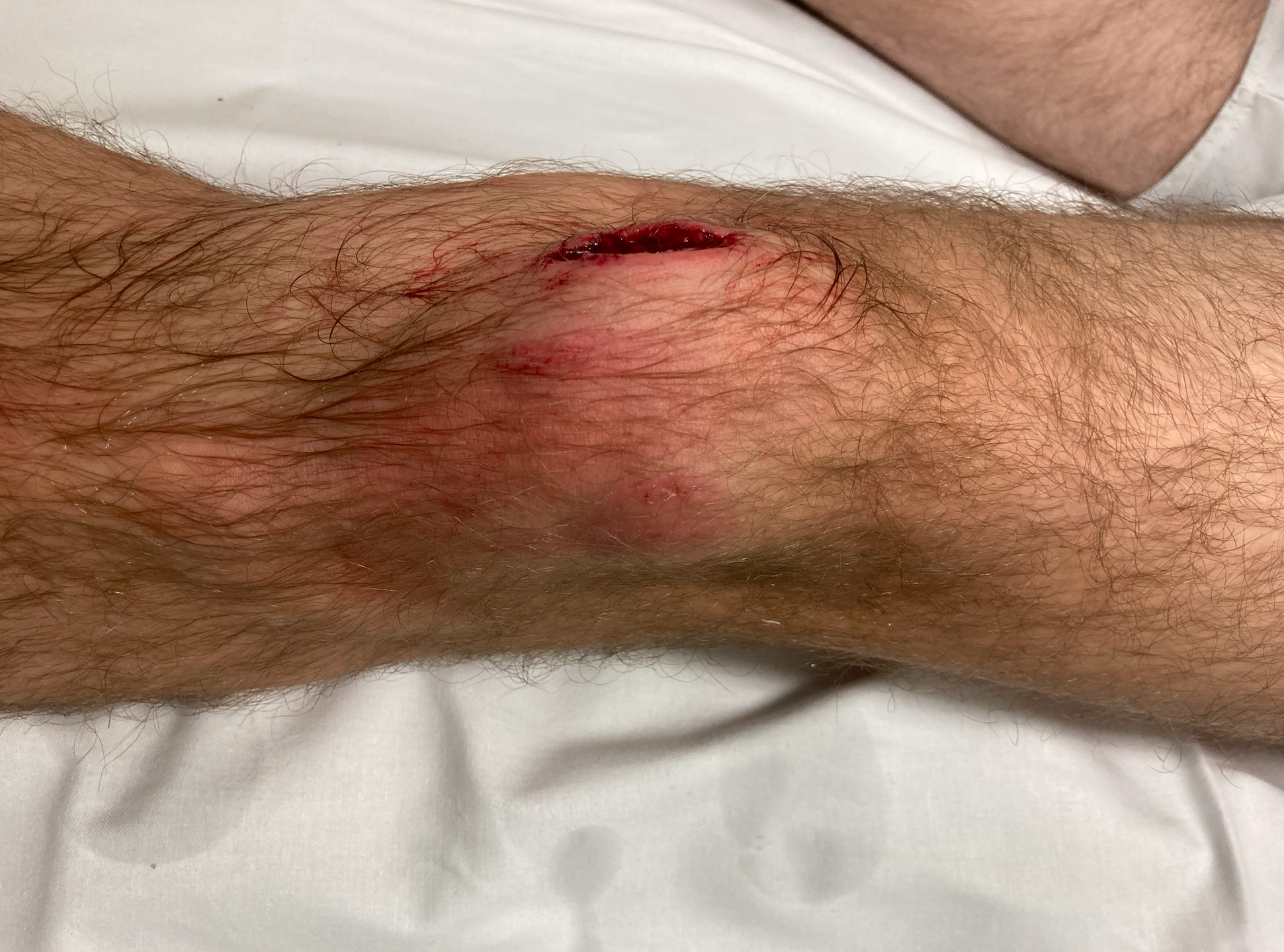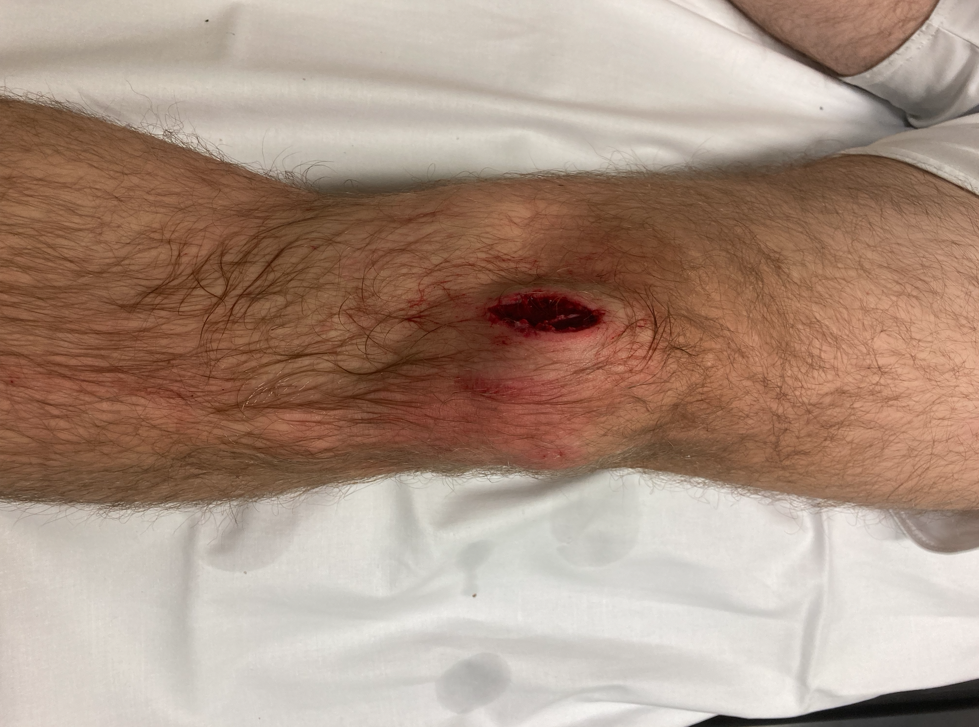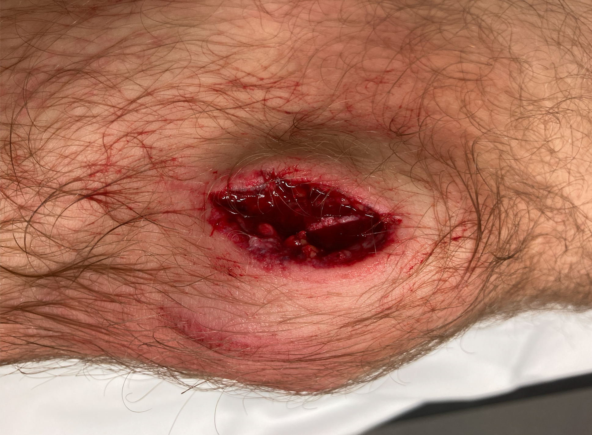 Nach Abnahme des durch den Rettungsdienst angebrachten Verbandes zeigt sich der unten dargestellte Befund.