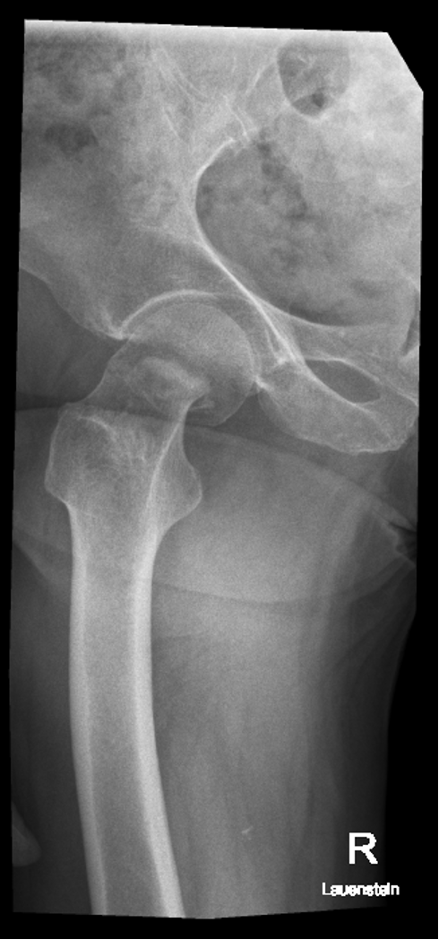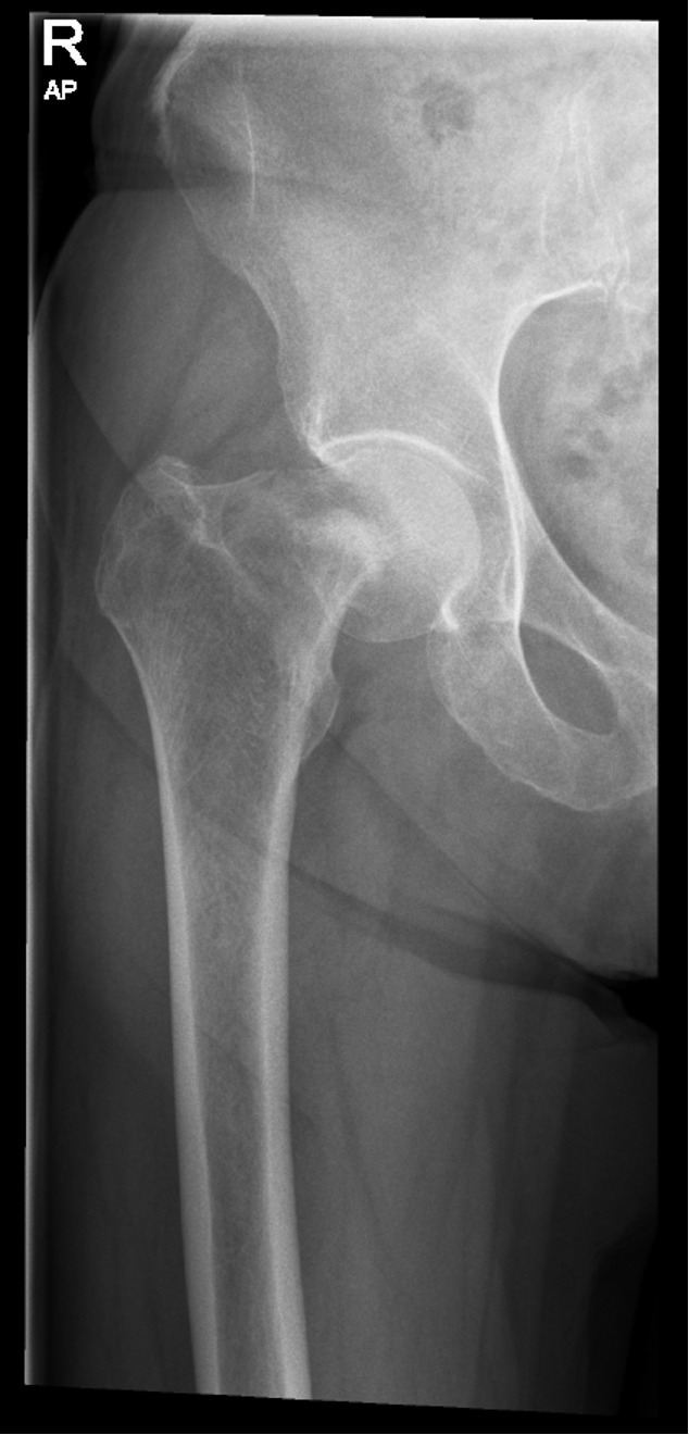 Eine 67-jährige Frau stellt sich in der Notaufnahme vor. Sie berichtet seit 2 Wochen Schmerzen in der rechten Leiste und dem ventralen Oberschenkel bemerkt zu haben. An einen Sturz oder einen anderen Traumamechanismus könne sie sich nicht erinnern. Sie habe es zunächst für muskuläre Beschwerden gehalten, eine Ultraschall-Untersuchung des Hausarzt war jedoch unauffällig und auch eine Thrombose konnte ausgeschlossen werden. Da nun das Gehen deutlich schwerer falle, habe der Hausarzt ein Röntgenbild anfertigen lassen und sie in Ihre Notfallambulanz eingewiesen.