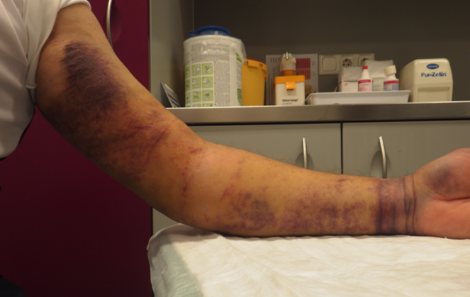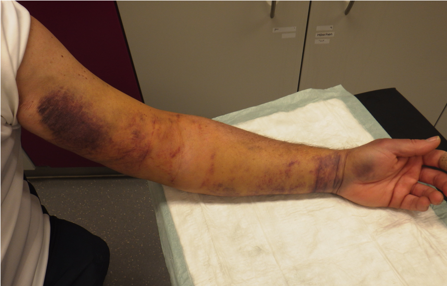 Ein 54 Jahre alter Patient stellt sich bei Ihnen in der Notfallambulanz vor. Er erzählt vor 5 Tagen bei seiner Tätigkeit als Postbote gestolpert und nach hinten gefallen zu sein. Dabei habe er seinen Arm nach hinten geschwungen um sich abzufangen und dabei einen stechenden Schmerz verspürt. Er war bereits am Unfalltag bei einer Kollegin von Ihnen in der Nofallambulanz. Diese hatte eine Schwellung und ein Hämatom am Unter- und Oberarm medialseitig inspektorisch, sowie ein Kraftdefizit beim Heben im Ellenbogen festgestellt. Im daraufhin angefertigten Röntgenbild (siehe unten) wurde keine Fraktur festgestellt. Daraufhin wurde ein Oberarm-Cast angelegt und dem Patienten ein zeitnaher MRT-Termin organisiert. Nun stellt sich der Patient zur Befundbesprechug und Planung des Procedere vor. Nach Abnahme der Gipsschiene sehen Sie folgenden Inspektionsbefund.
