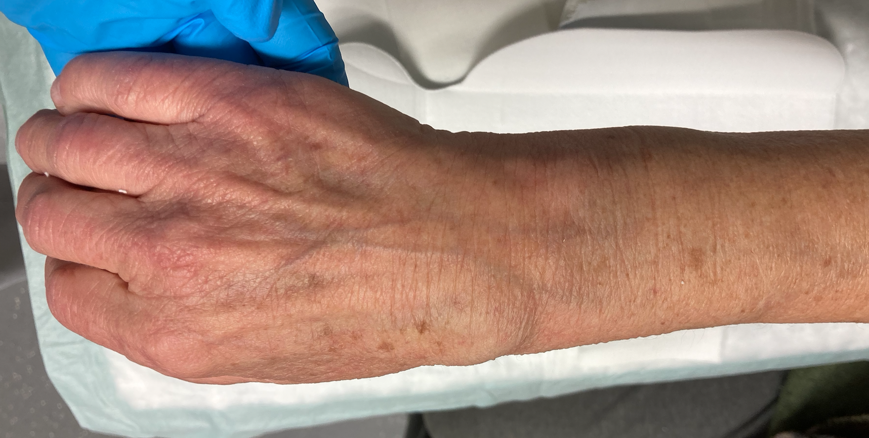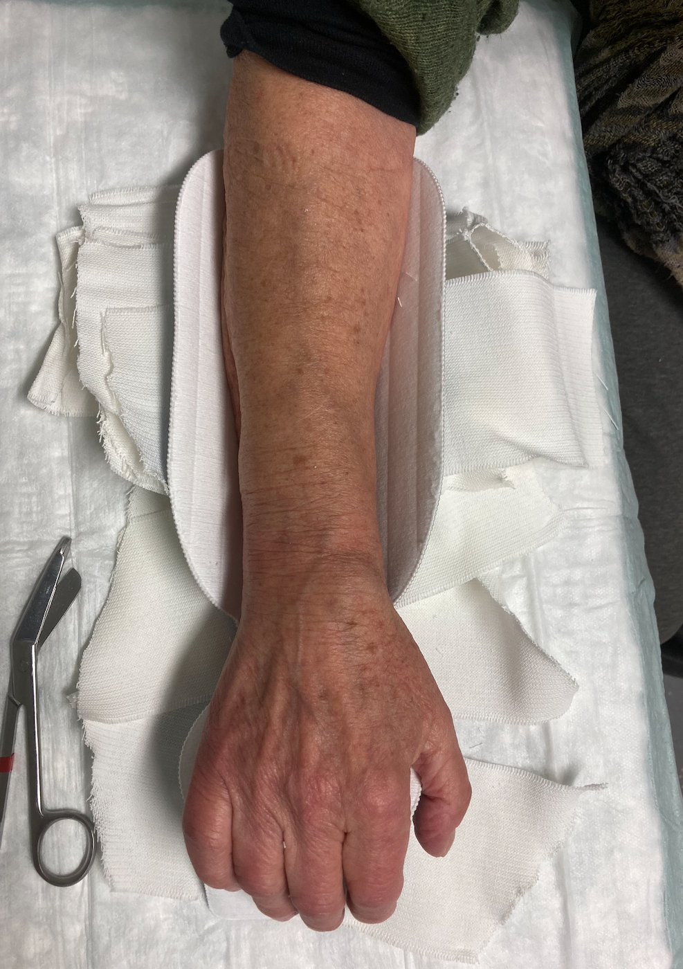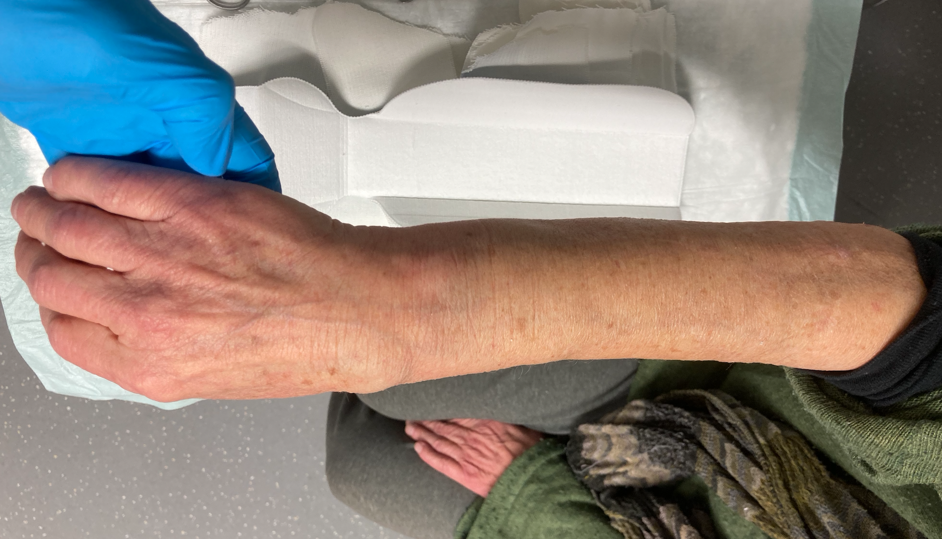 Nach Abnahme einer initial angelegten Unterarmschiene zeigt sich der unten dargestellter Inspektionsbefund (siehe Abbildung).