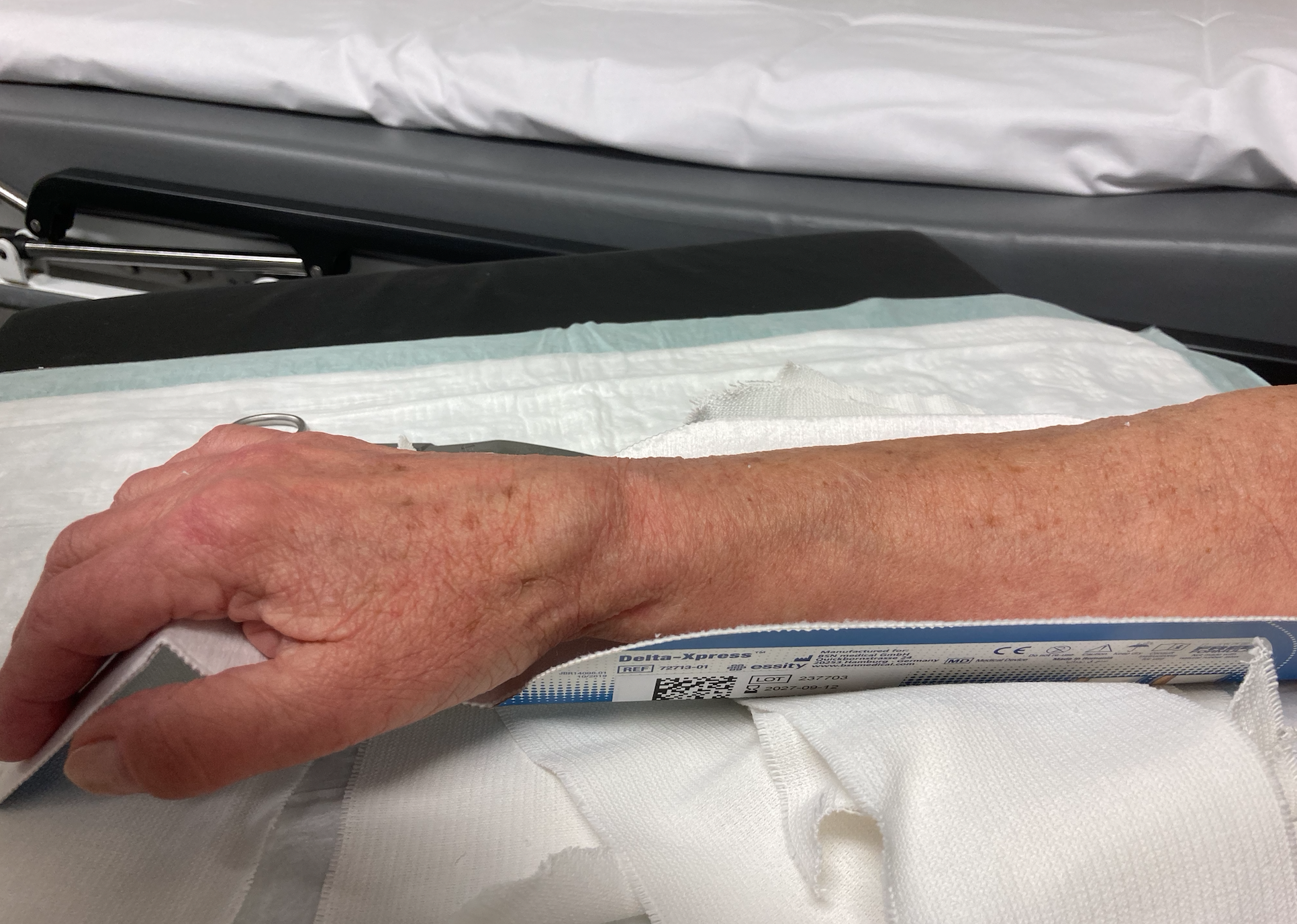 Eine 74-jährige Patentin stellt sich in der Notfallambulanz vor. Sie erfahren, dass sie am heutigen Tag bei einer Chiropraktiker-Behandlung von der Behandlungsliege (ca. 1 Meter Höhe) über die linke Seite auf den Boden gefallen sei. Dabei habe sie eine Rotationsbewegung durchgeführt und sei auf dem rechten Handgelenk gelandet. Nun habe sie Schmerzen und könne das Handgelenk nicht mehr bewegen. Ein leichter Anprall sei auch am linken Knie erfolgt. Dort habe sie jedoch keine Beschwerden mehr.