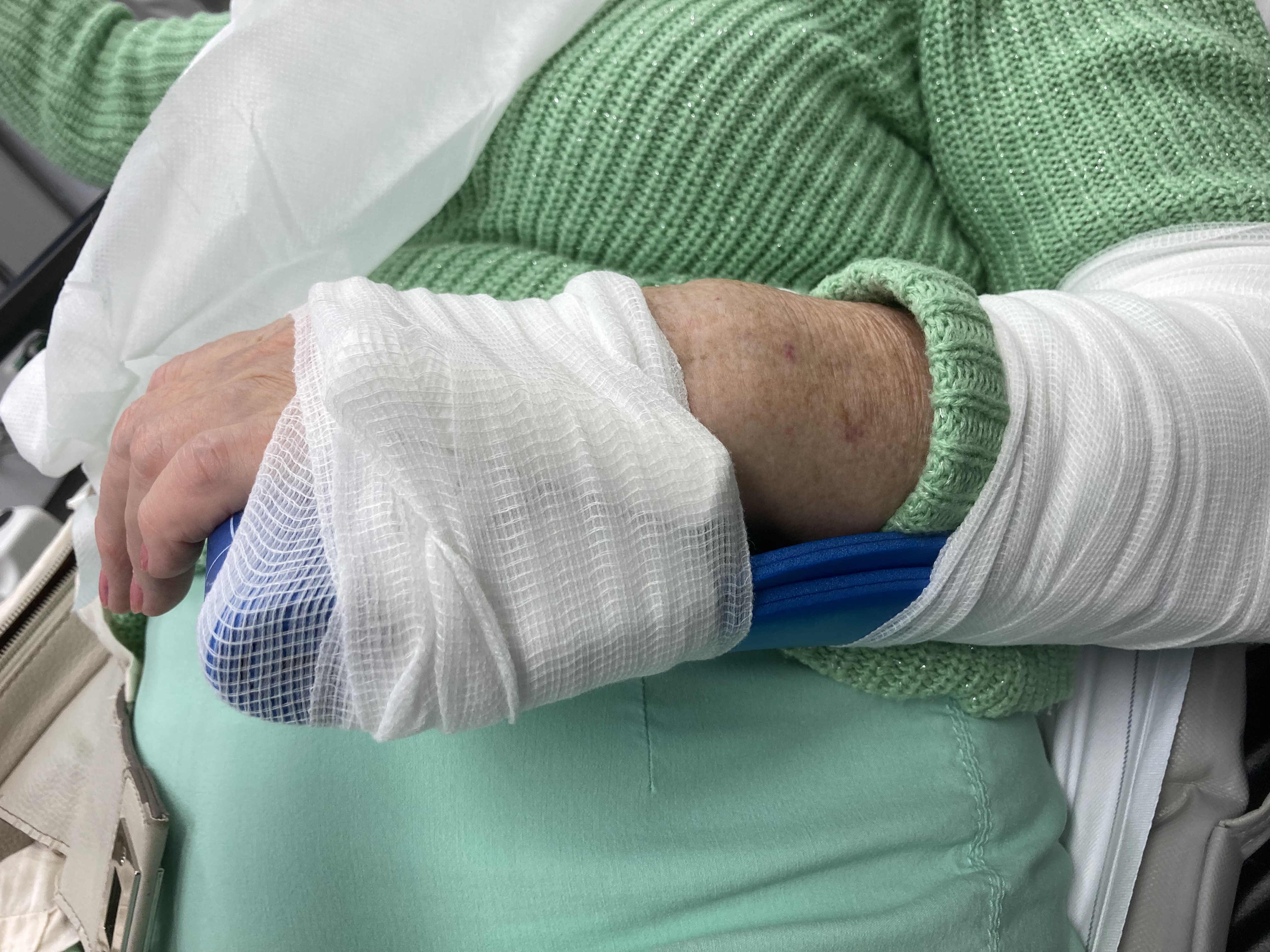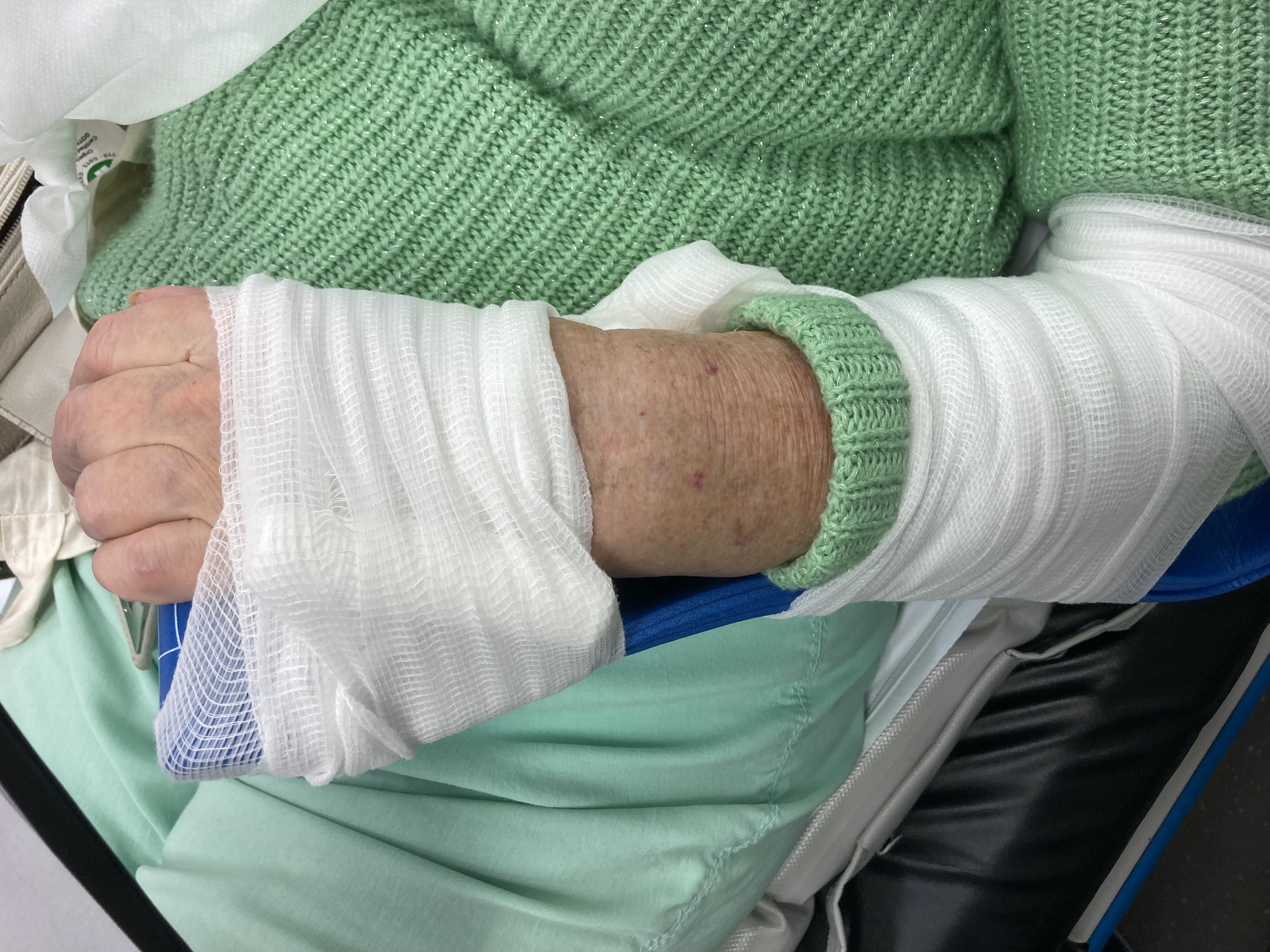Der Rettungsdienst stellt eine 90-jährige Patientin aus dem betreuten Wohnen vor, die am selben Tag gestürzt war. In der Anamnese berichtet die Patientin auf dem Weg zum Einkaufen neben ihrem Auto ausgerutscht und auf dem Gesäß sowie dem linken Unterarm gelandet zu sein. Seitdem habe sie starke Schmerzen, sowie eine Fehlstellung im Bereich des Unterarmes bemerkt. Das Gesäß sei etwas schmerzhaft und das Gehen noch möglich.