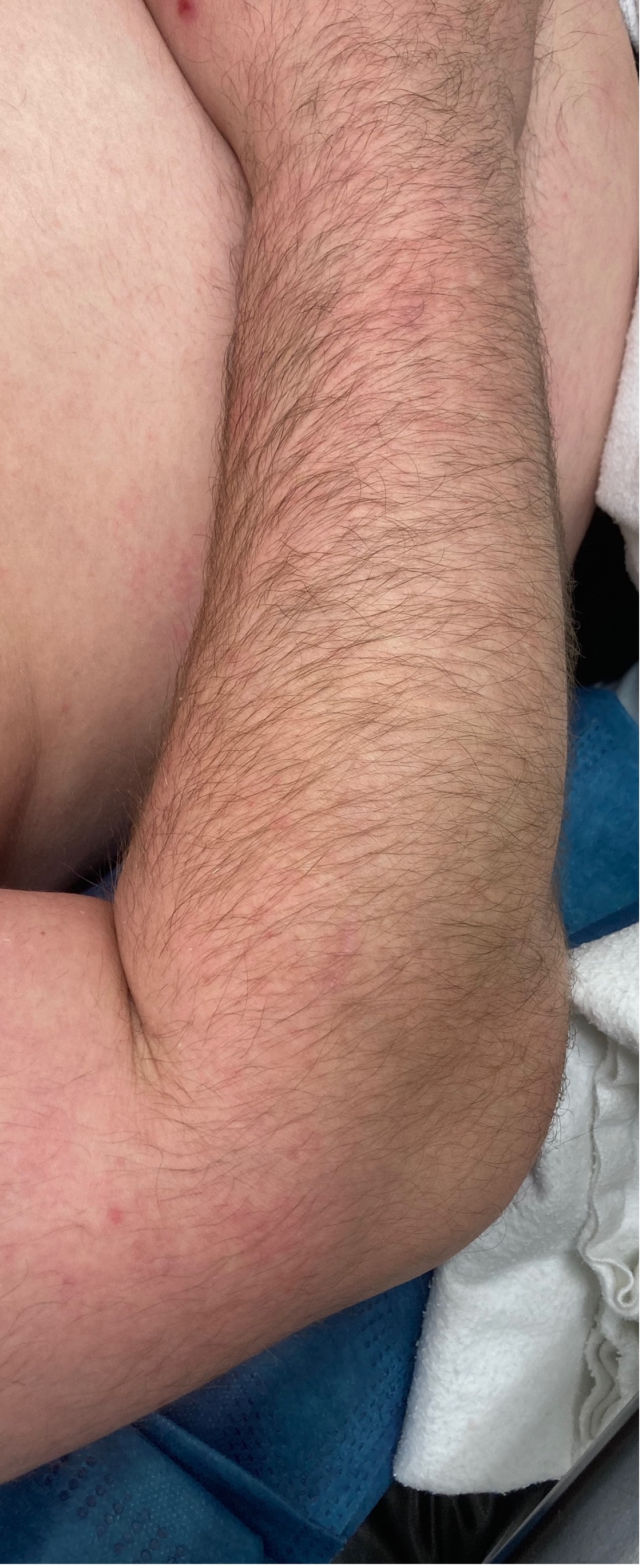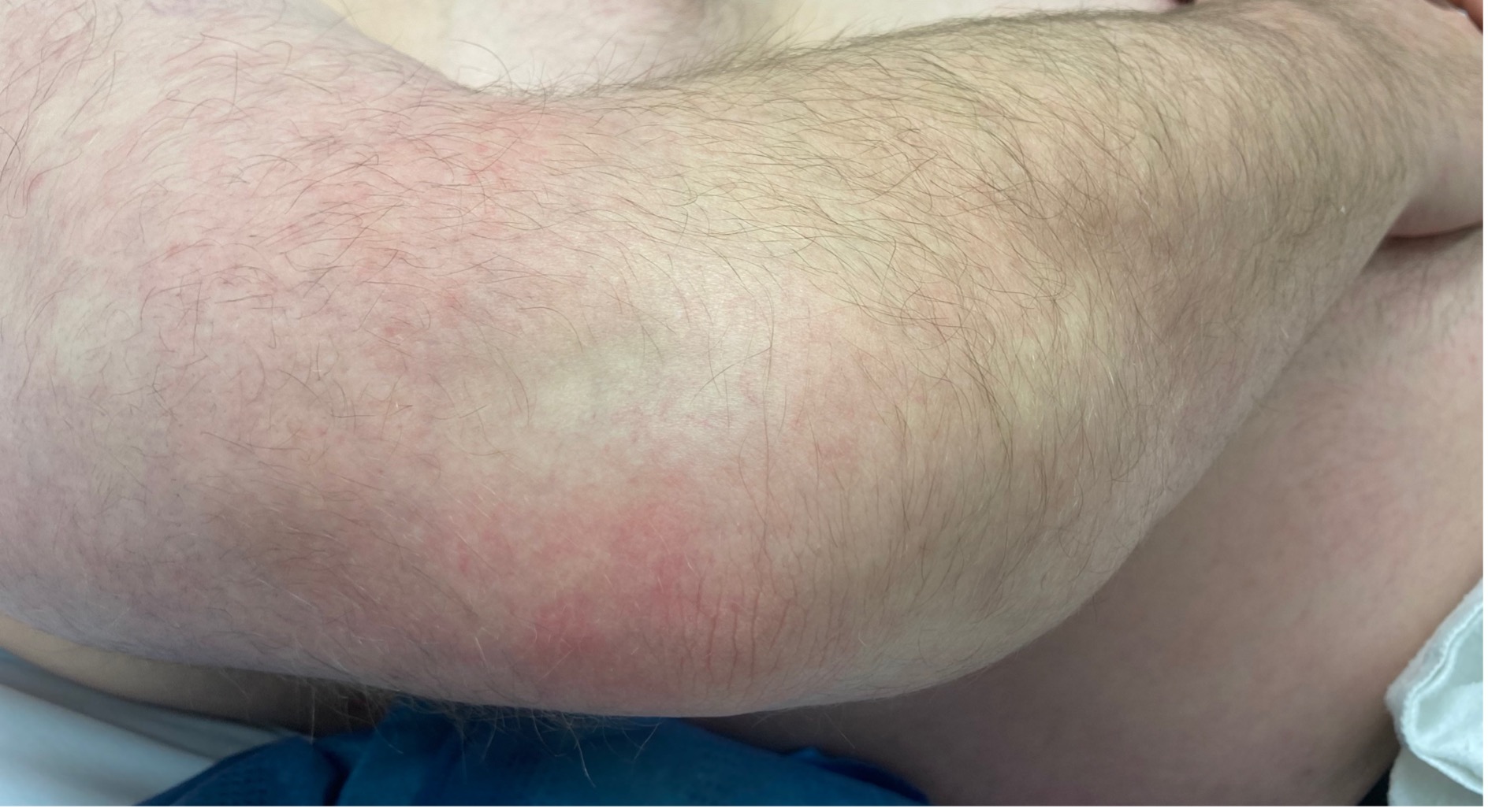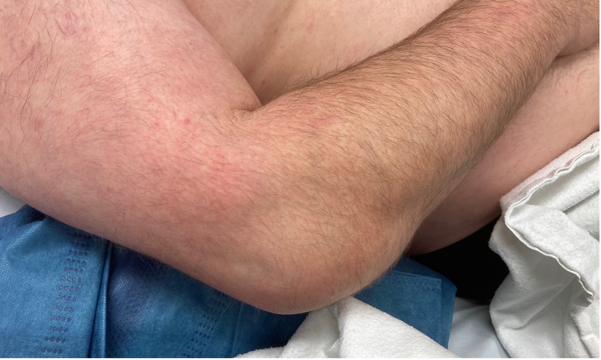Ein 52-jähriger Patient stellt sich über den Rettungsdienst bei Ihnen in der Notfallambulanz vor. Er berichtet im Sicherheitsdienst tätig zu sein und auf dem Arbeitsweg unglücklich gestolpert, nach hinten gefallen und mit dem angewinkelten rechten Ellenbogen direkt auf dem Boden aufgeprallt zu sein. Seitdem habe er bei jeglicher Bewegung im Ellenbogen Schmerzen. In Ruhe sei es erträglich.